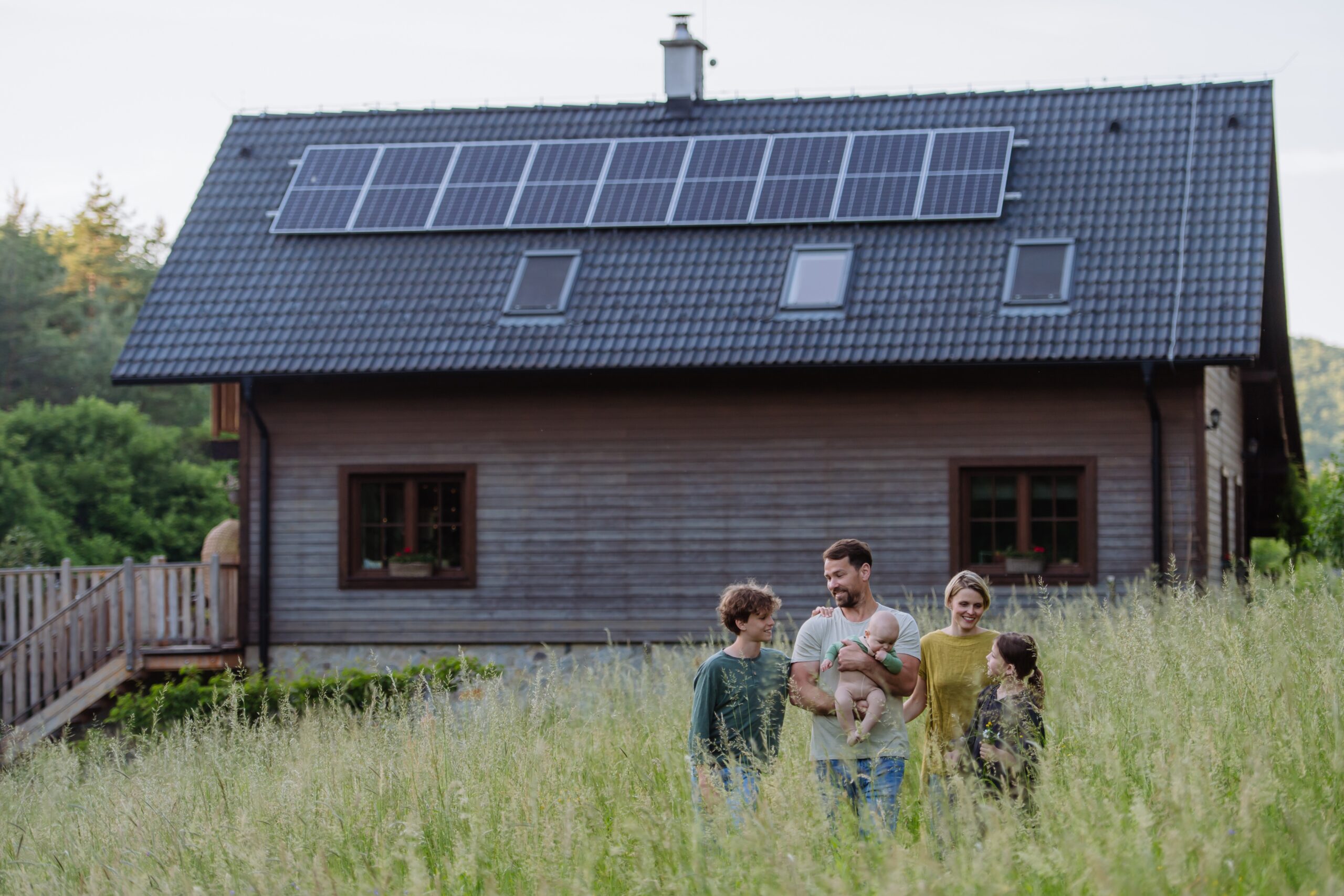 Happy family near their house with solar panels. Alternative energy, saving resources and sustainable lifestyle concept.